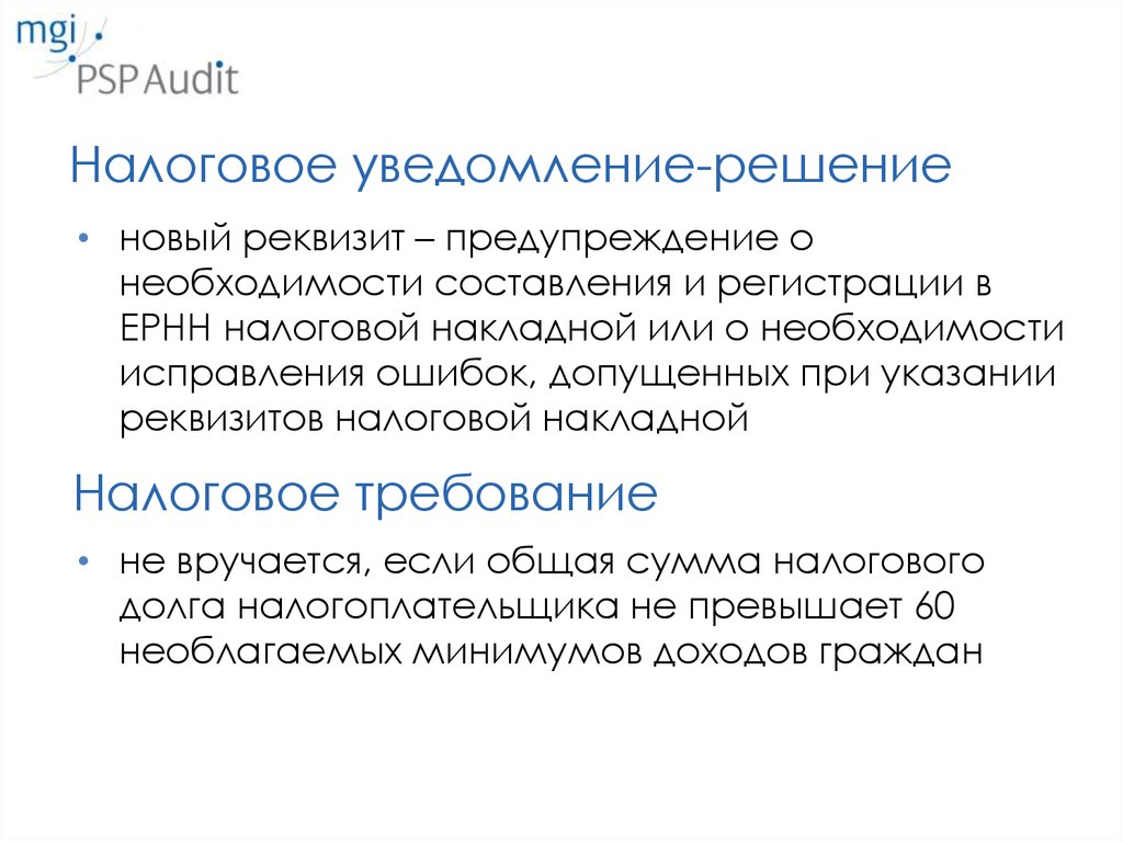 Налоговое уведомление-решение• новый реквизит – предупреждение о