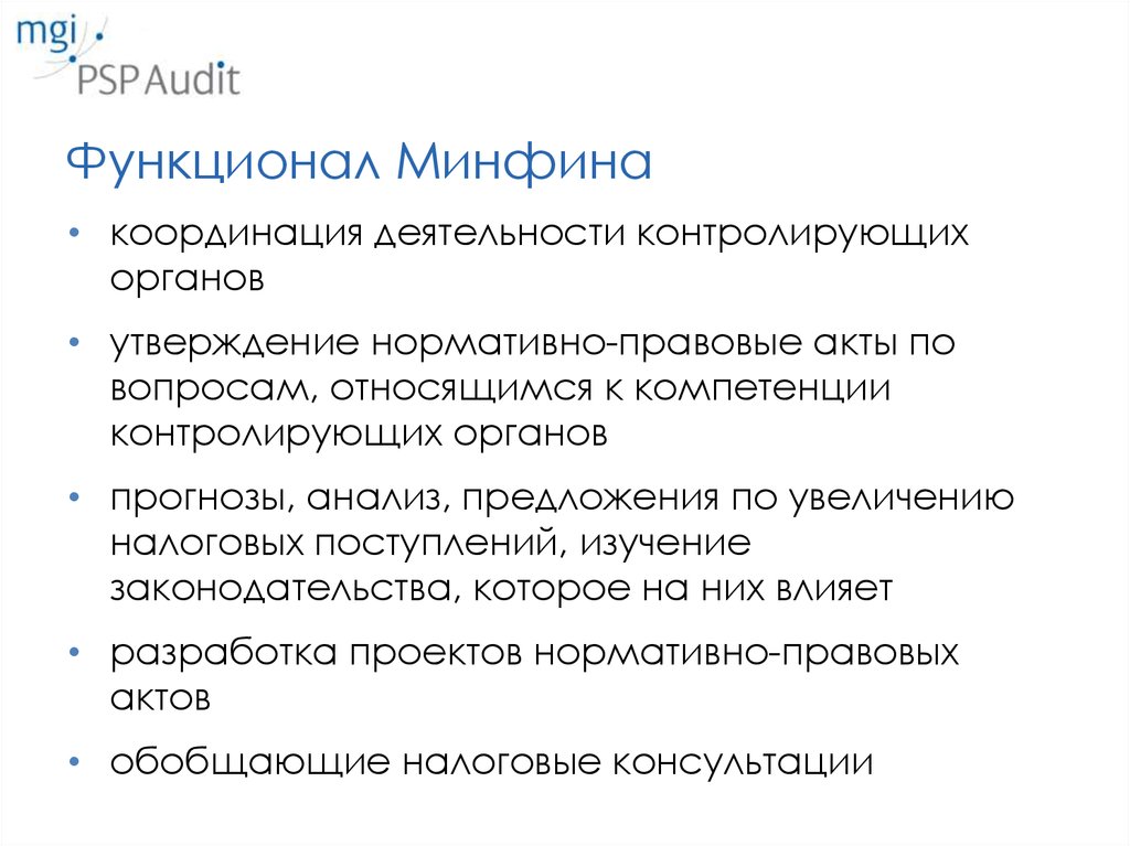 Функционал Минфина• координация деятельности контролирующих