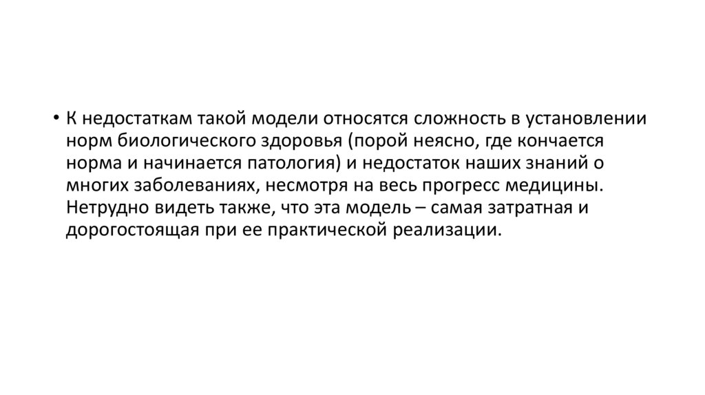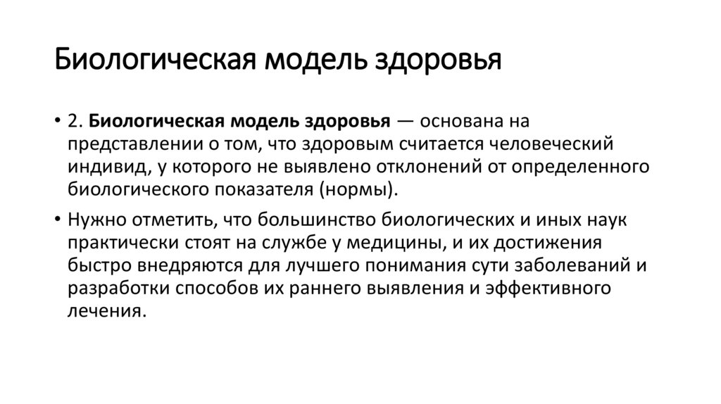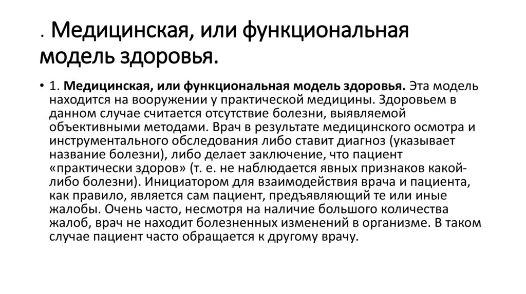 • 1. Медицинская, или функциональная модель здоровья. Эта модель