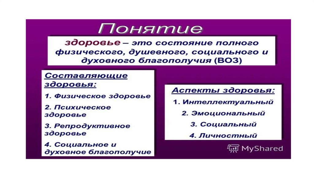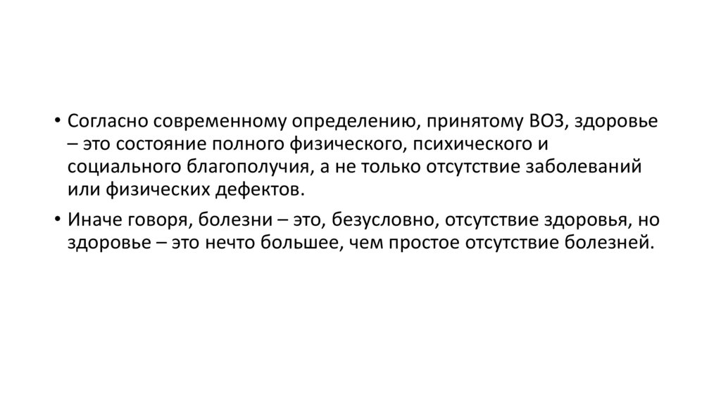 • Согласно современному определению, принятому ВОЗ, здоровье– это состояние полного физического, психического и