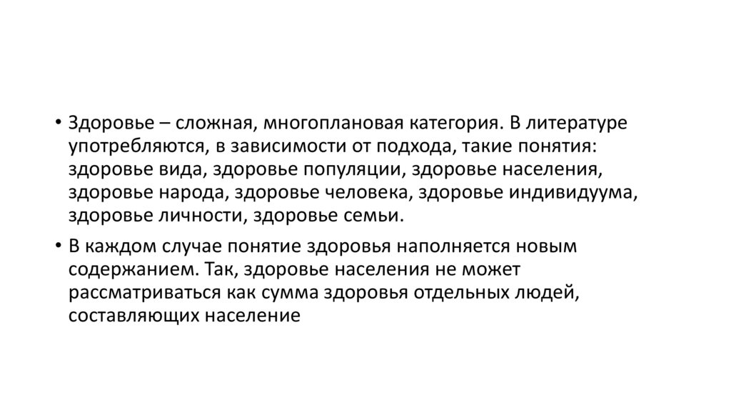 • Здоровье – сложная, многоплановая категория. В литературеупотребляются, в зависимости от подхода, такие понятия: