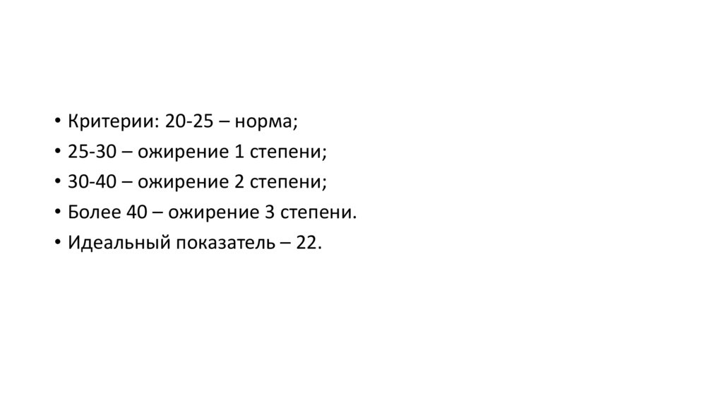 • Критерии: - 5 – ожирение; - 5-12 – норма; - 12 и более –