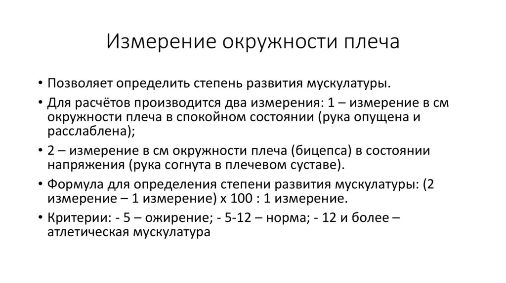 Измерение окружности плеча• Позволяет определить степень развития мускулатуры.