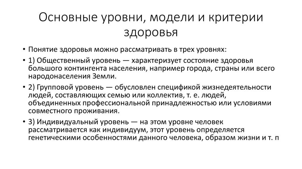 • Понятие здоровья можно рассматривать в трех уровнях: