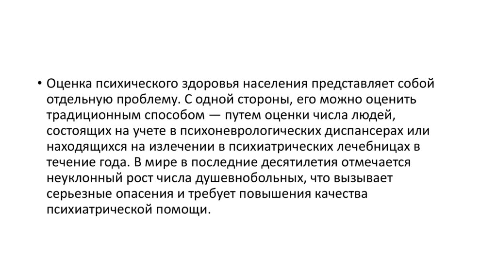 • Оценка психического здоровья населения представляет собойотдельную проблему. С одной стороны, его можно оценить
