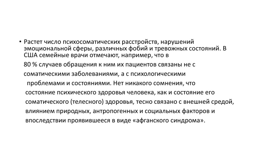 • Растет число психосоматических расстройств, нарушенийэмоциональной сферы, различных фобий и тревожных состояний. В