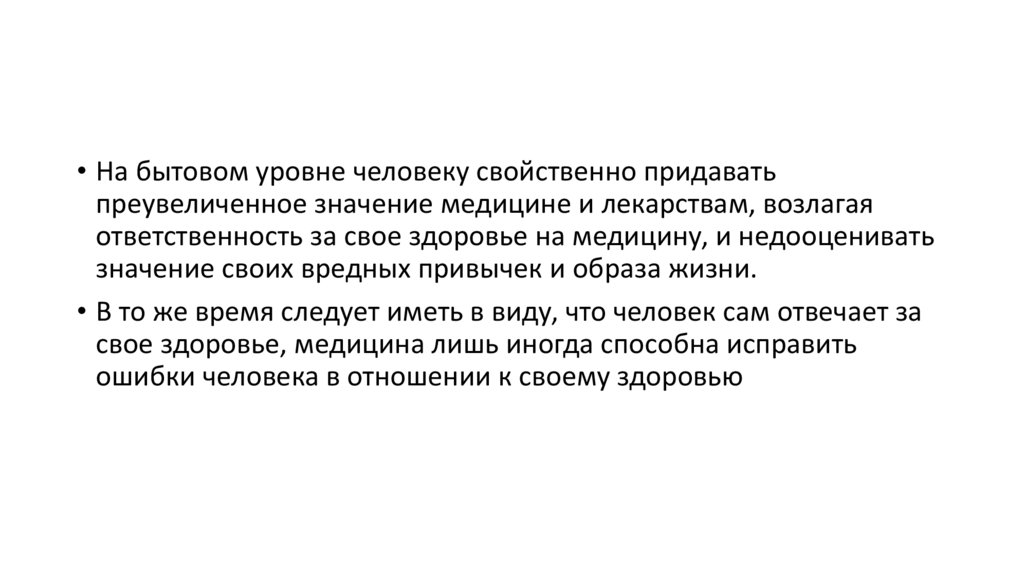 • На бытовом уровне человеку свойственно придаватьпреувеличенное значение медицине и лекарствам, возлагая