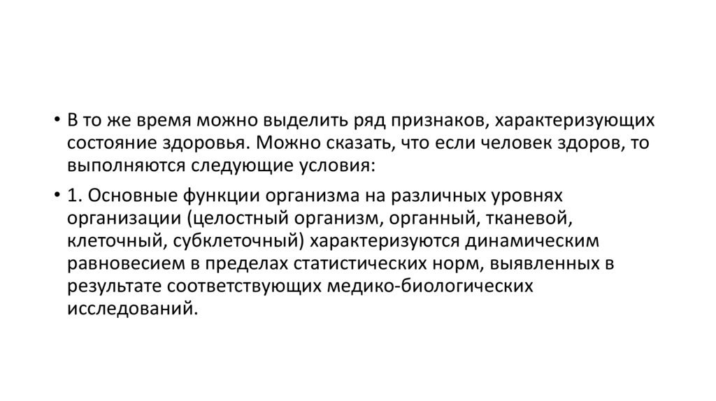 • В то же время можно выделить ряд признаков, характеризующихсостояние здоровья. Можно сказать, что если человек здоров, то