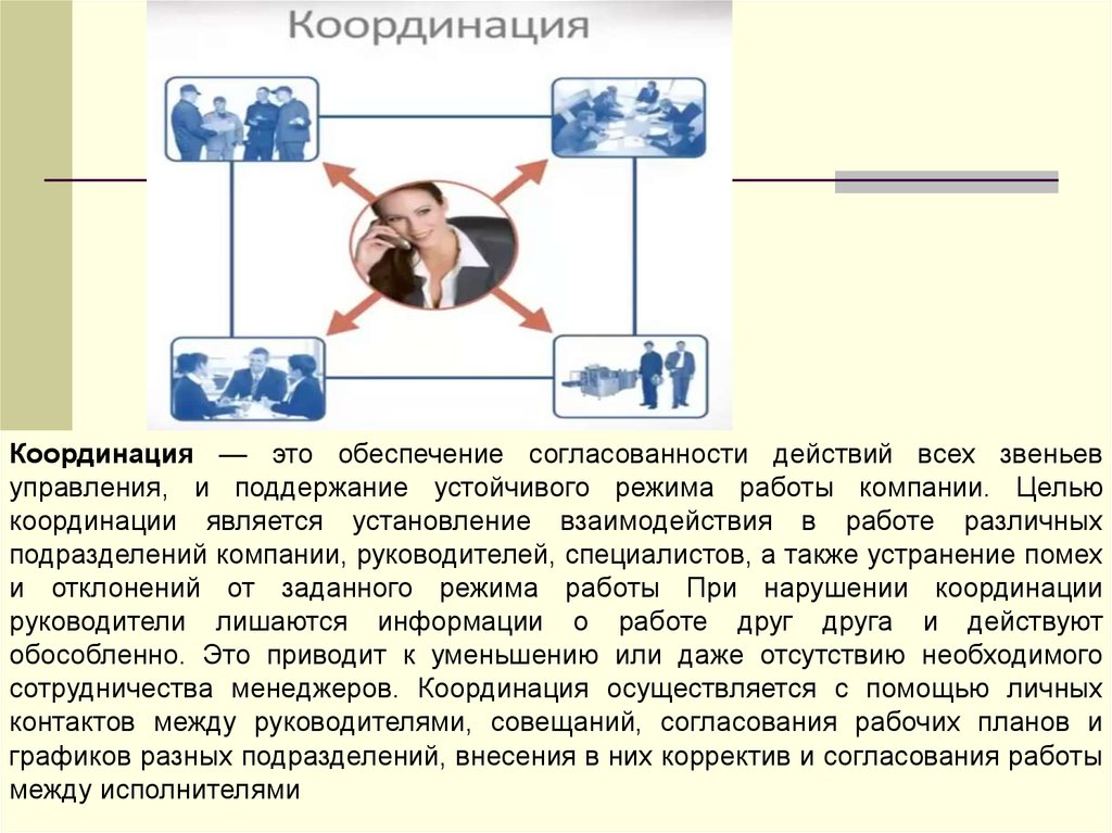 Координация — это обеспечение согласованности действий всех звеньевуправления, и поддержание устойчивого режима работы компании. Целью