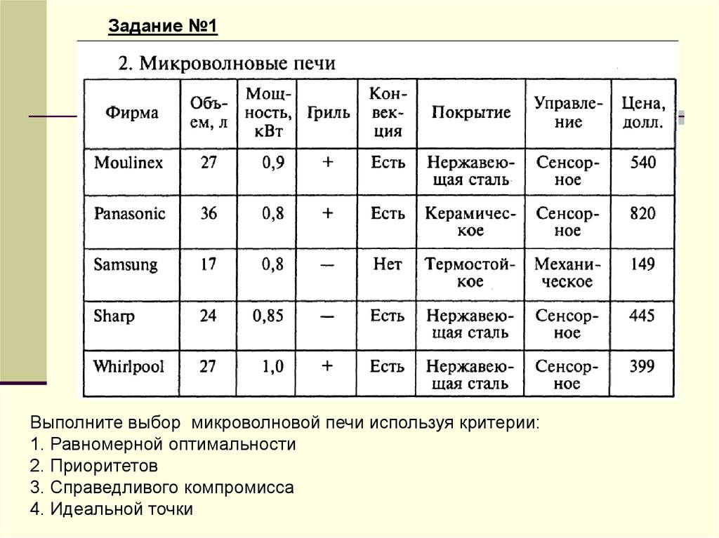 Задание №1Выполните выбор микроволновой печи используя критерии: