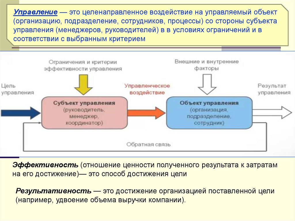 Управление — это целенаправленное воздействие на управляемый объект(организацию, подразделение, сотрудников, процессы) со стороны субъекта