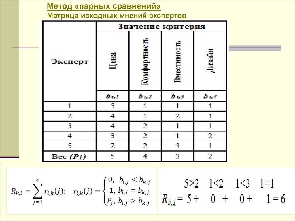 Метод «парных сравнений»Матрица исходных мнений экспертов