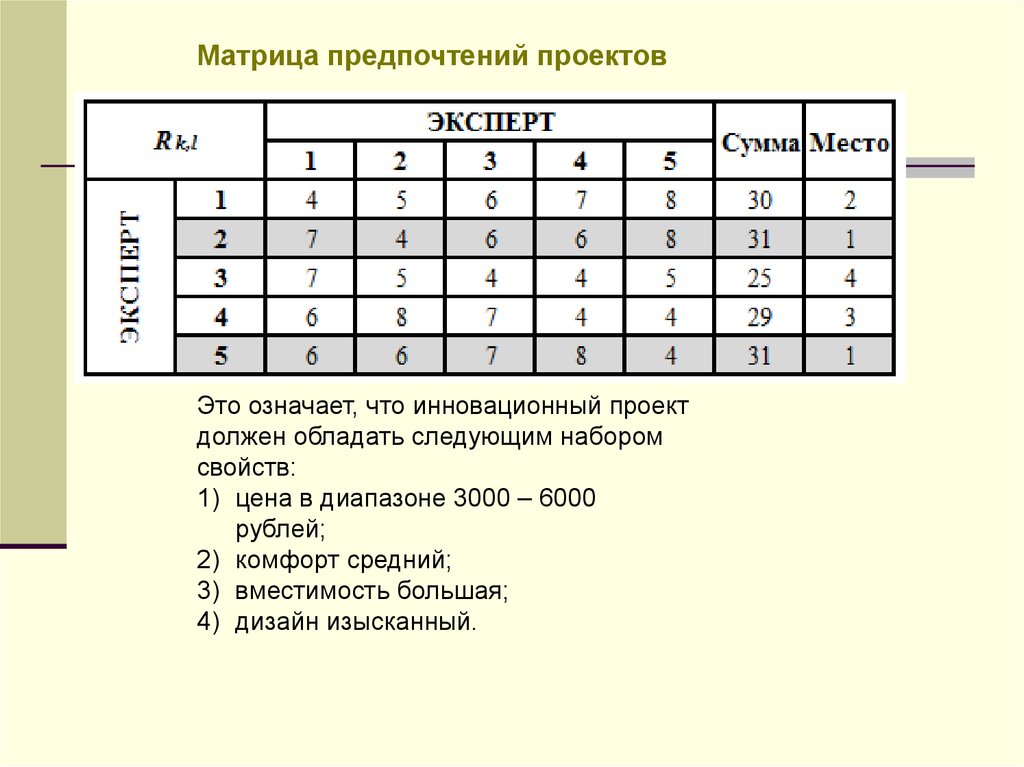 Матрица предпочтений проектовЭто означает, что инновационный проект