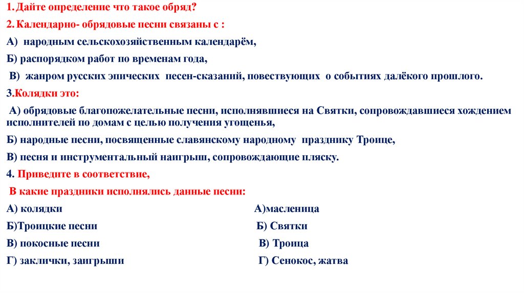 1. Дайте определение что такое обряд?2. Календарно- обрядовые песни связаны с :