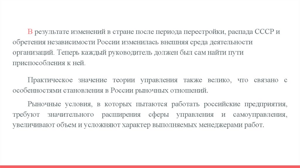 В результате изменений в стране после периода перестройки, распада СССР иобретения независимости России изменилась внешняя среда деятельности