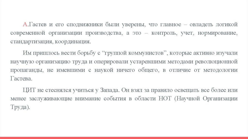 А.Гастев и его сподвижники были уверены, что главное – овладеть логикойсовременной организации производства, а это – контроль, учет, нормирование,