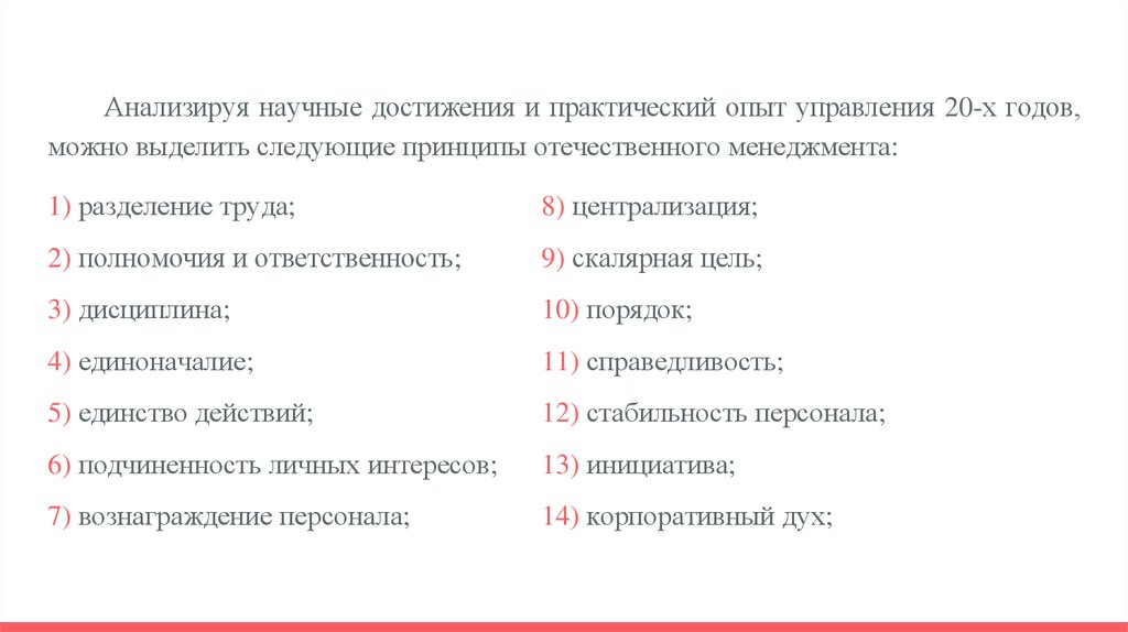 Анализируя научные достижения и практический опыт управления 20-х годов,можно выделить следующие принципы отечественного менеджмента: