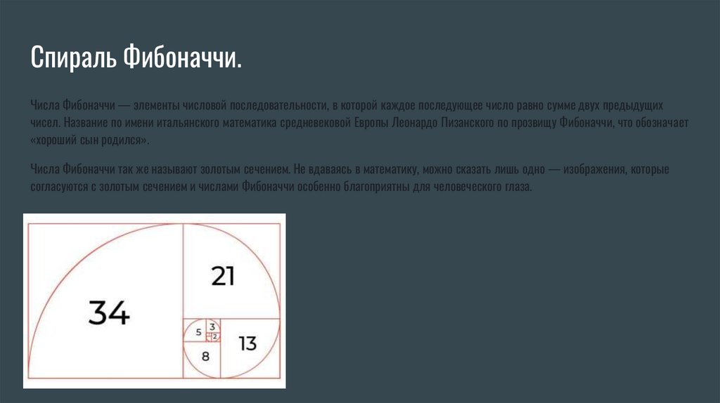 Числа Фибоначчи так же называют золотым сечением. Не вдаваясь в математику, можно сказать лишь одно — изображения, которые