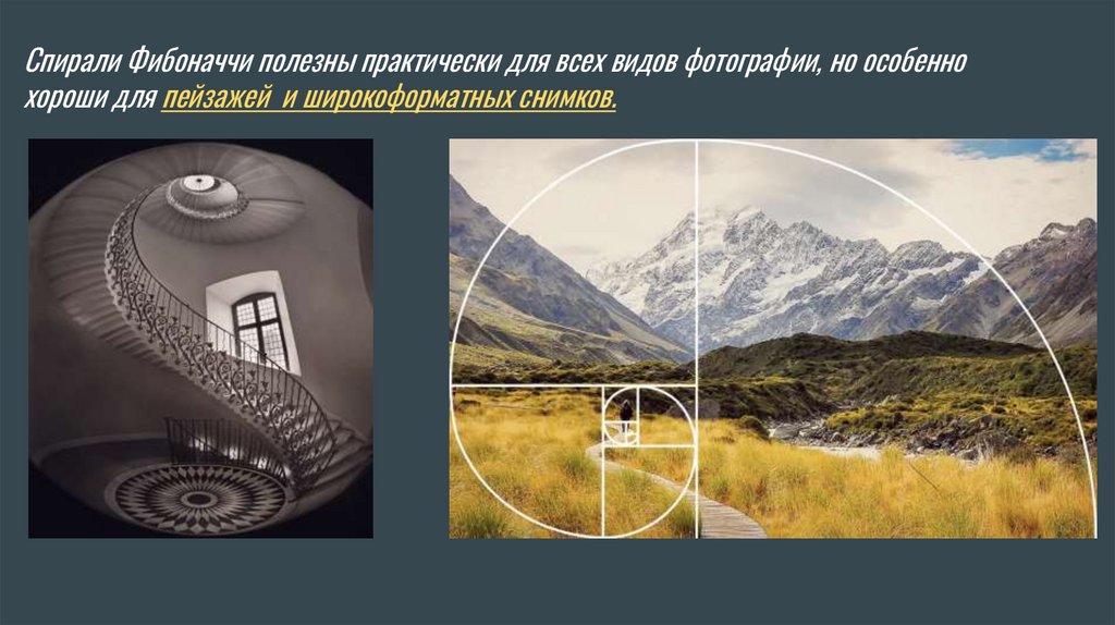 Спирали Фибоначчи полезны практически для всех видов фотографии, но особеннохороши для пейзажей и широкоформатных снимков.