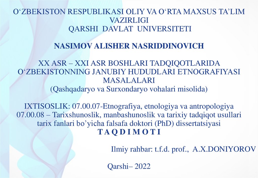 IXTISOSLIK: 07.00.07-Etnografiya, etnologiya va antropologiya