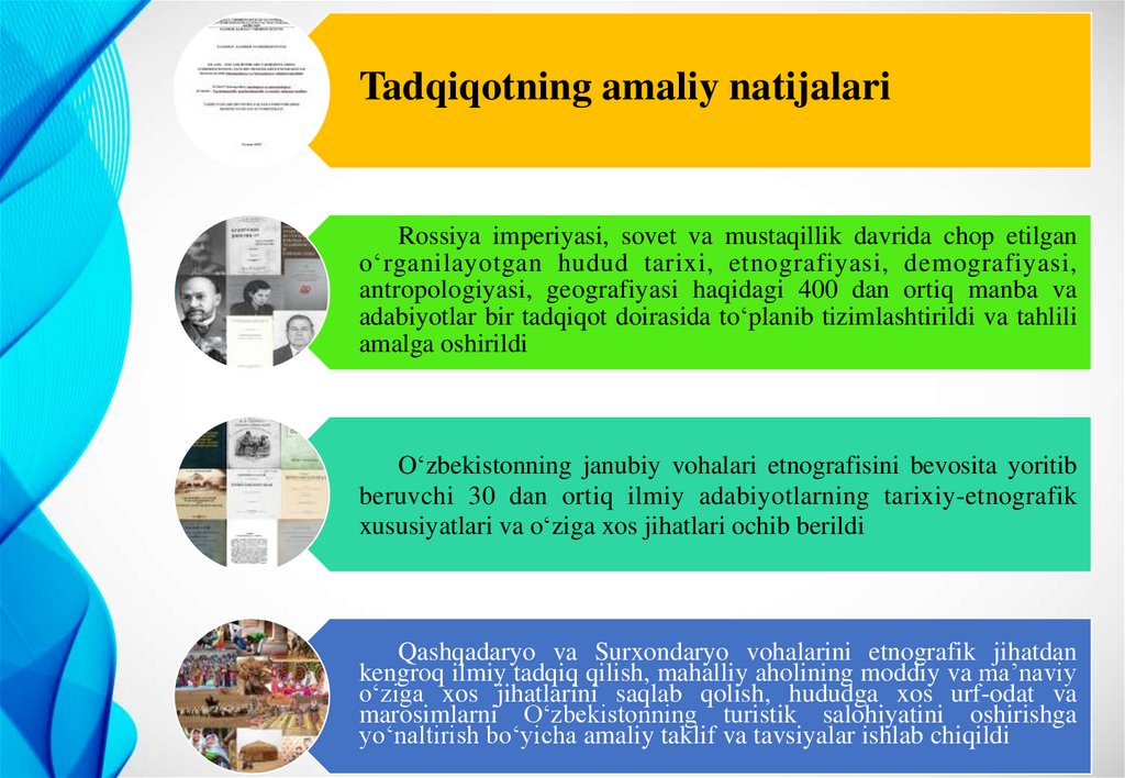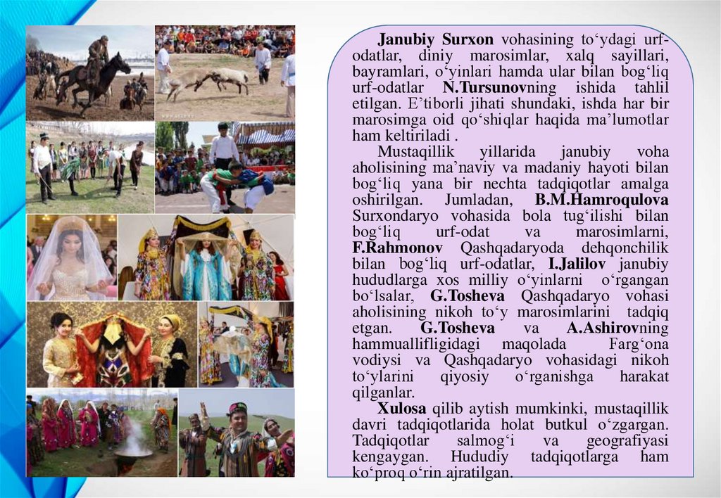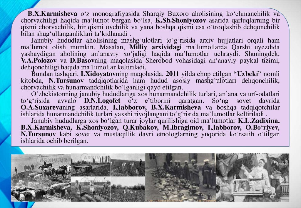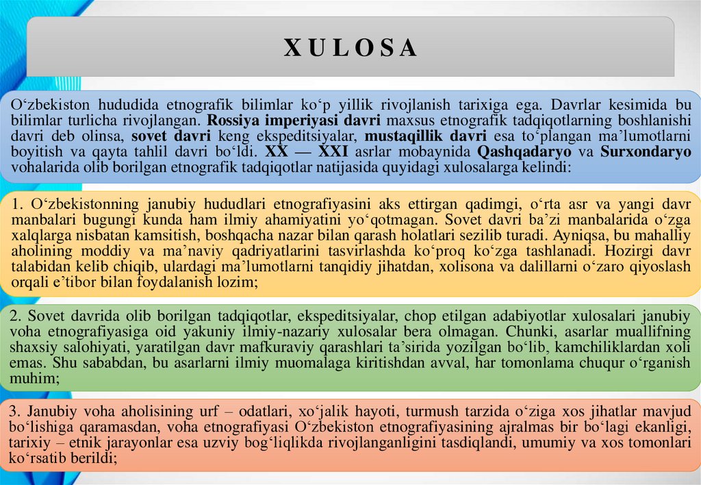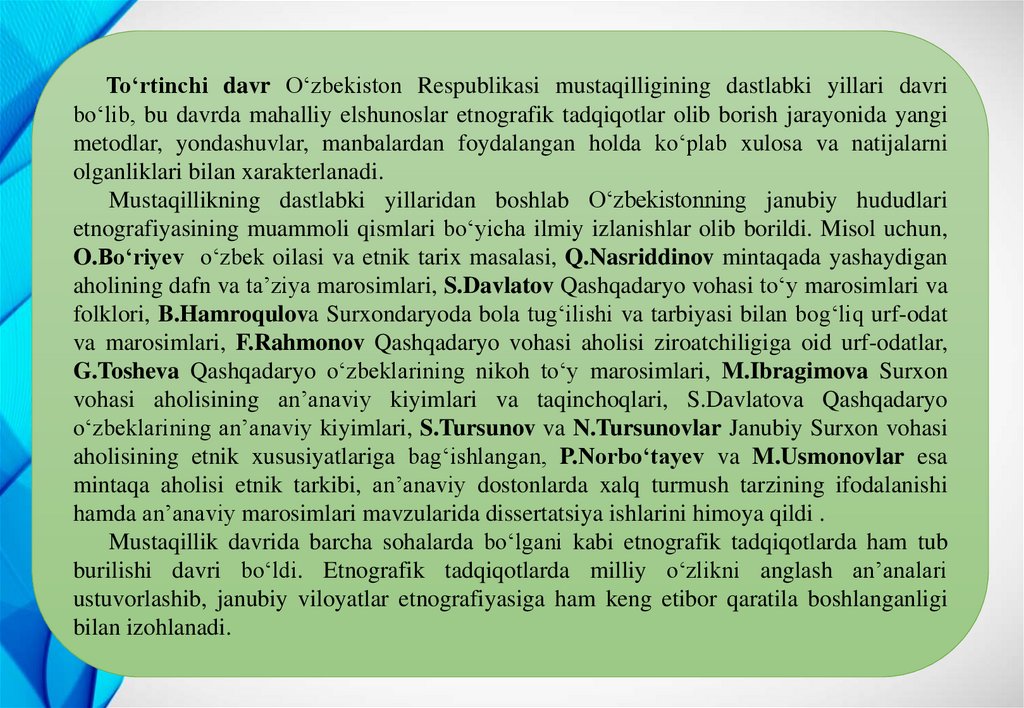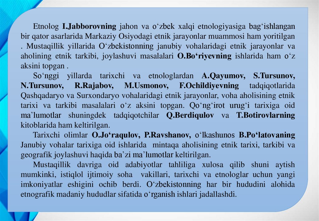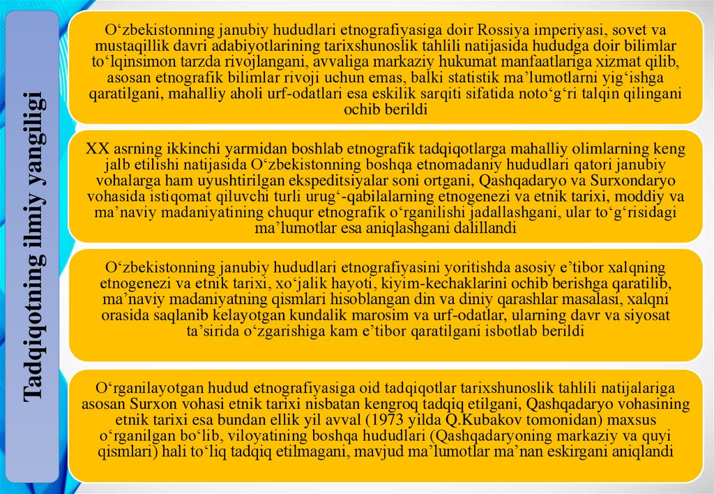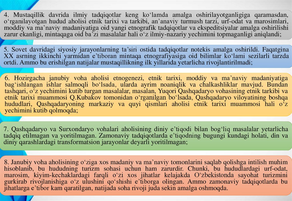 4. Mustaqillik davrida ilmiy tadqiqotlar keng ko‘lamda amalga oshirilayotganligiga qaramasdan,o‘rganilayotgan hudud aholisi etnik tarixi va tarkibi, an’anaviy turmush tarzi, urf-odat va marosimlari,