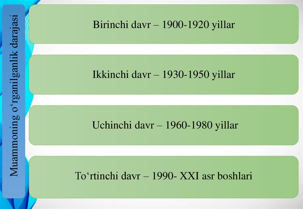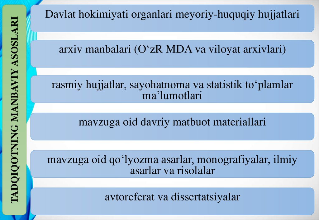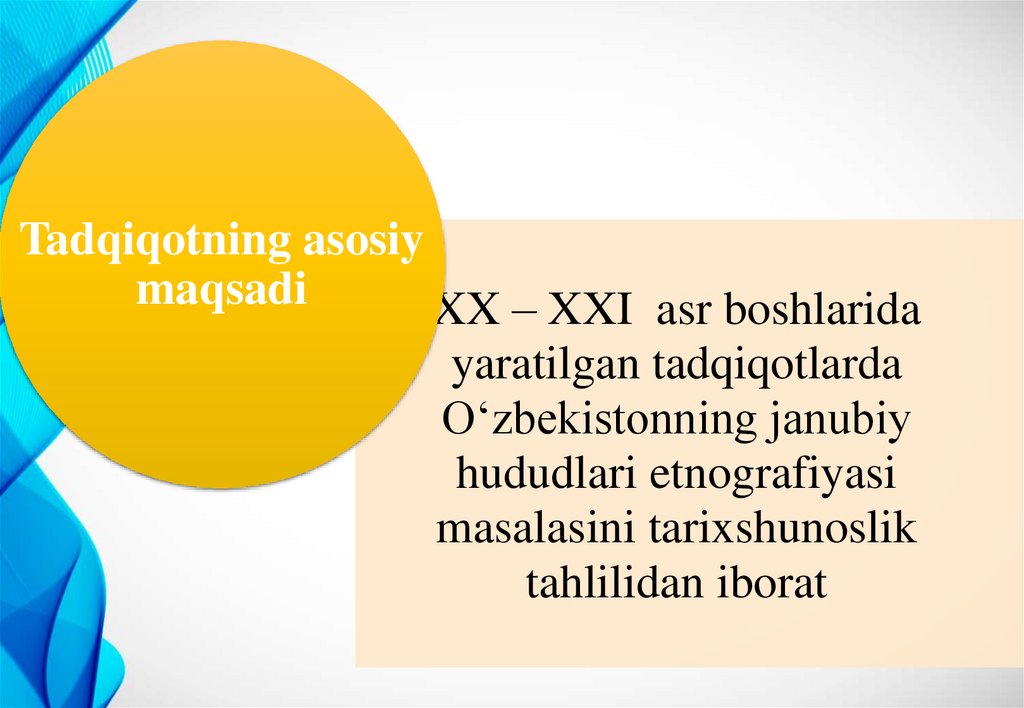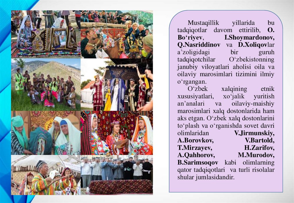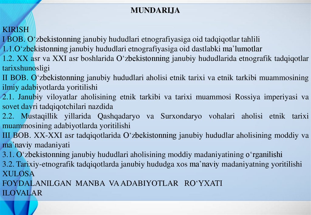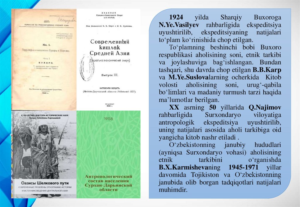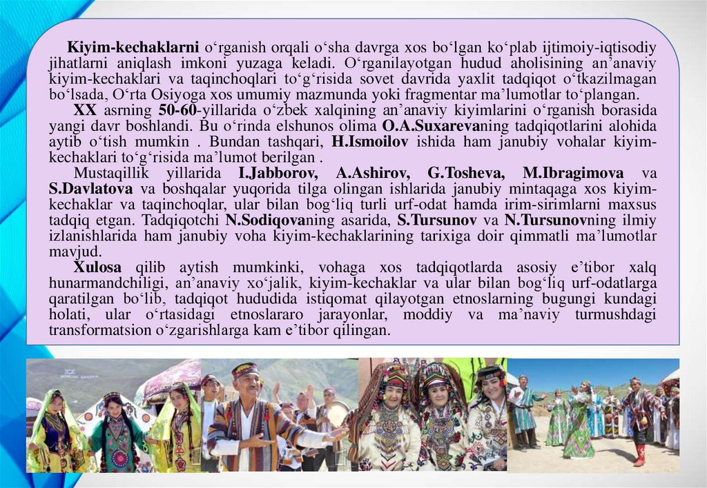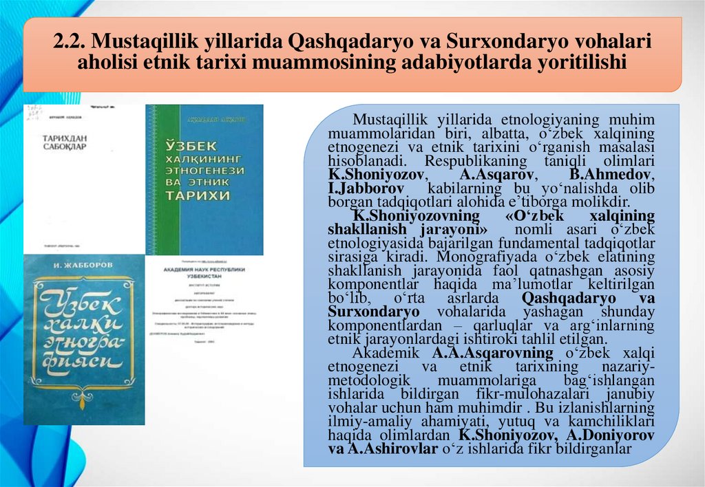 4. Mustaqillik davrida ilmiy tadqiqotlar keng ko‘lamda amalga oshirilayotganligiga qaramasdan,o‘rganilayotgan hudud aholisi etnik tarixi va tarkibi, an’anaviy turmush tarzi, urf-odat va marosimlari,