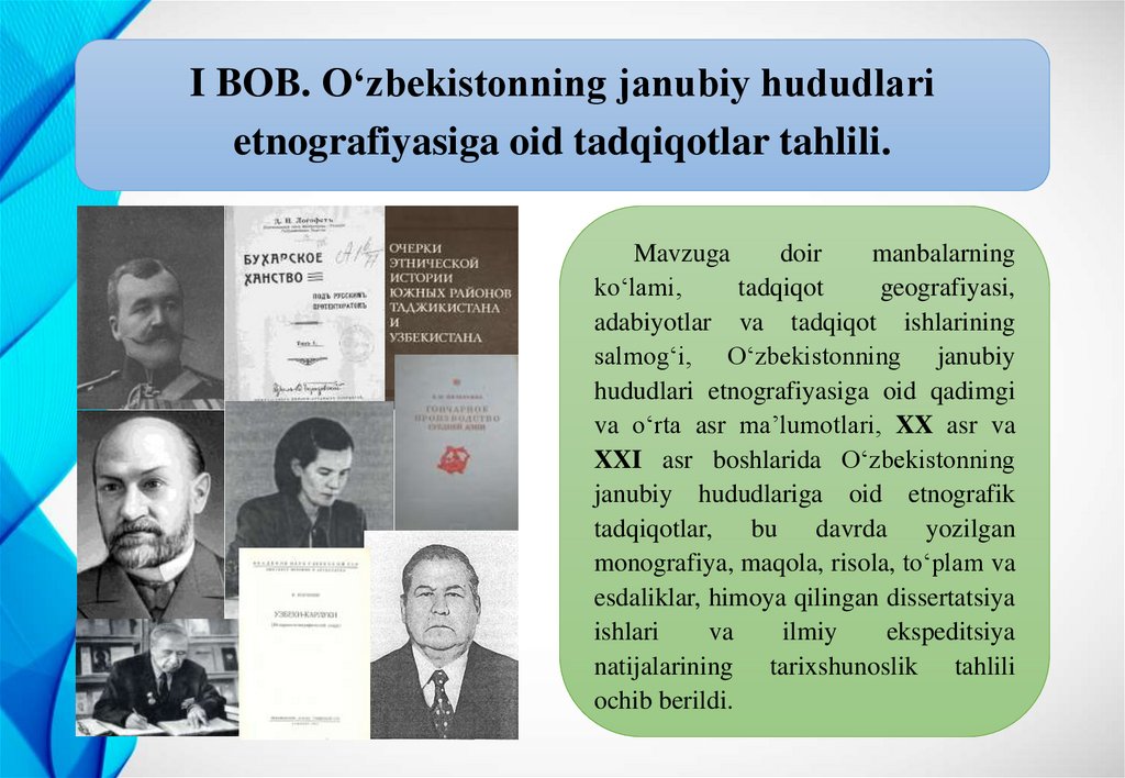 I BOB. O‘zbekistonning janubiy hududlari etnografiyasiga oid tadqiqotlar tahlili
