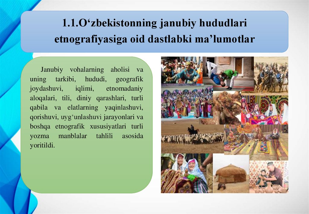 1.1.O‘zbekistonning janubiy hududlari etnografiyasiga oid dastlabki ma’lumotlar