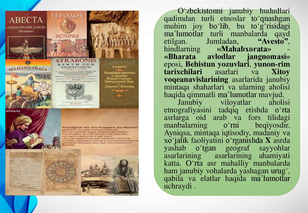 1. O‘zbekistonning janubiy hududlari etnografiyasini aks ettirgan qadimgi, o‘rta asr va yangi davr