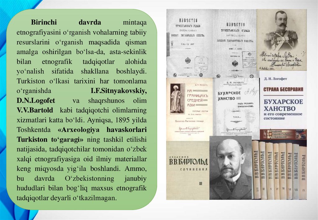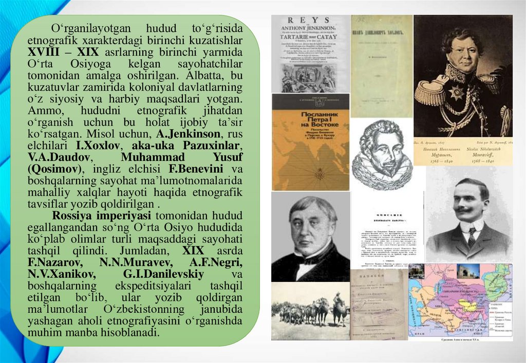 bilimlar turlicha rivojlangan. Rossiya imperiyasi davri maxsus etnografik tadqiqotlarning boshlanishi