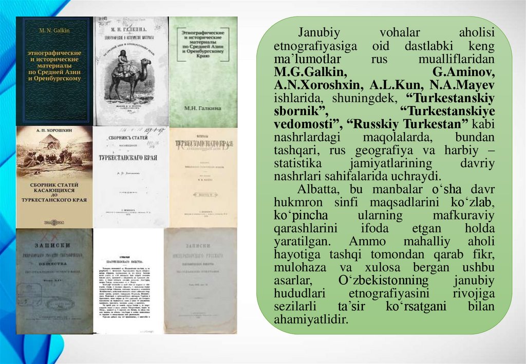 voha etnografiyasiga oid yakuniy ilmiy-nazariy xulosalar bera olmagan. Chunki, asarlar muallifning