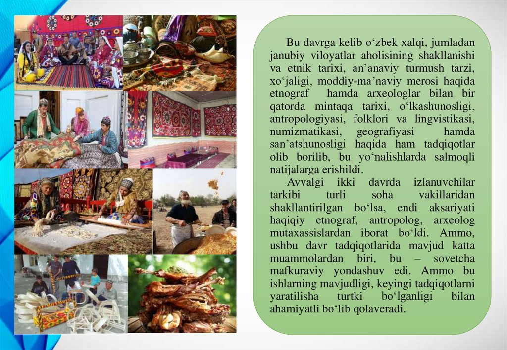 6. Hozirgacha janubiy voha aholisi etnogenezi, etnik tarixi, moddiy va ma’naviy madaniyatiga