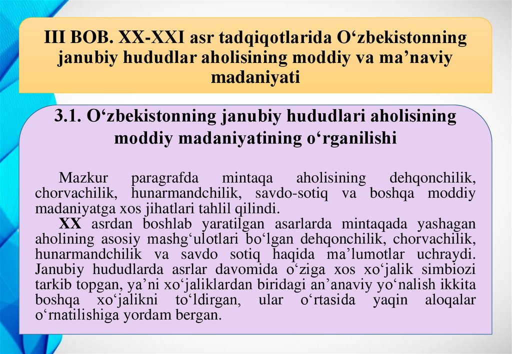 III BOB. XX-XXI asr tadqiqotlarida O‘zbekistonning janubiy hududlar aholisining moddiy va