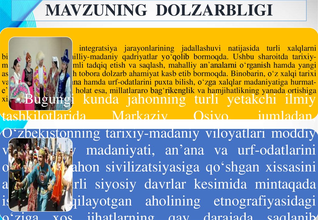 MAVZUNING DOLZARBLIGIGloballashuv va integratsiya jarayonlarining jadallashuvi natijasida turli xalqlarni