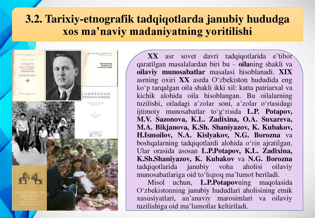 3.2. Tarixiy-etnografik tadqiqotlarda janubiy hududga xos ma’naviy madaniyatning yoritilishi