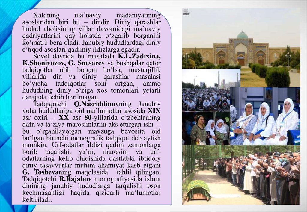 7. Qashqadaryo va Surxondaryo vohalari aholisining diniy e’tiqodi bilan bog‘liq masalalar yetarlicha