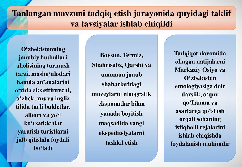 Tanlangan mavzuni tadqiq etish jarayonida quyidagi taklifva tavsiyalar ishlab chiqildi