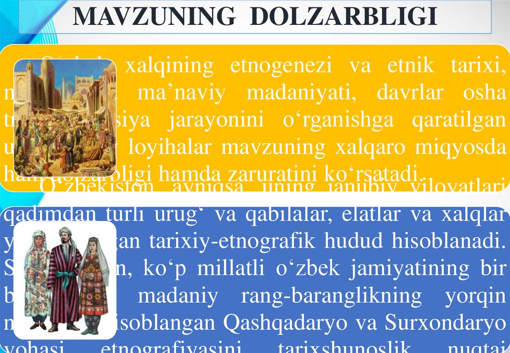 MAVZUNING DOLZARBLIGIO‘zbek xalqining etnogenezi va etnik tarixi,