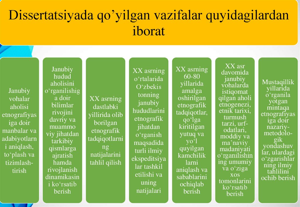 Dissertatsiyada qo’yilgan vazifalar quyidagilardaniborat
