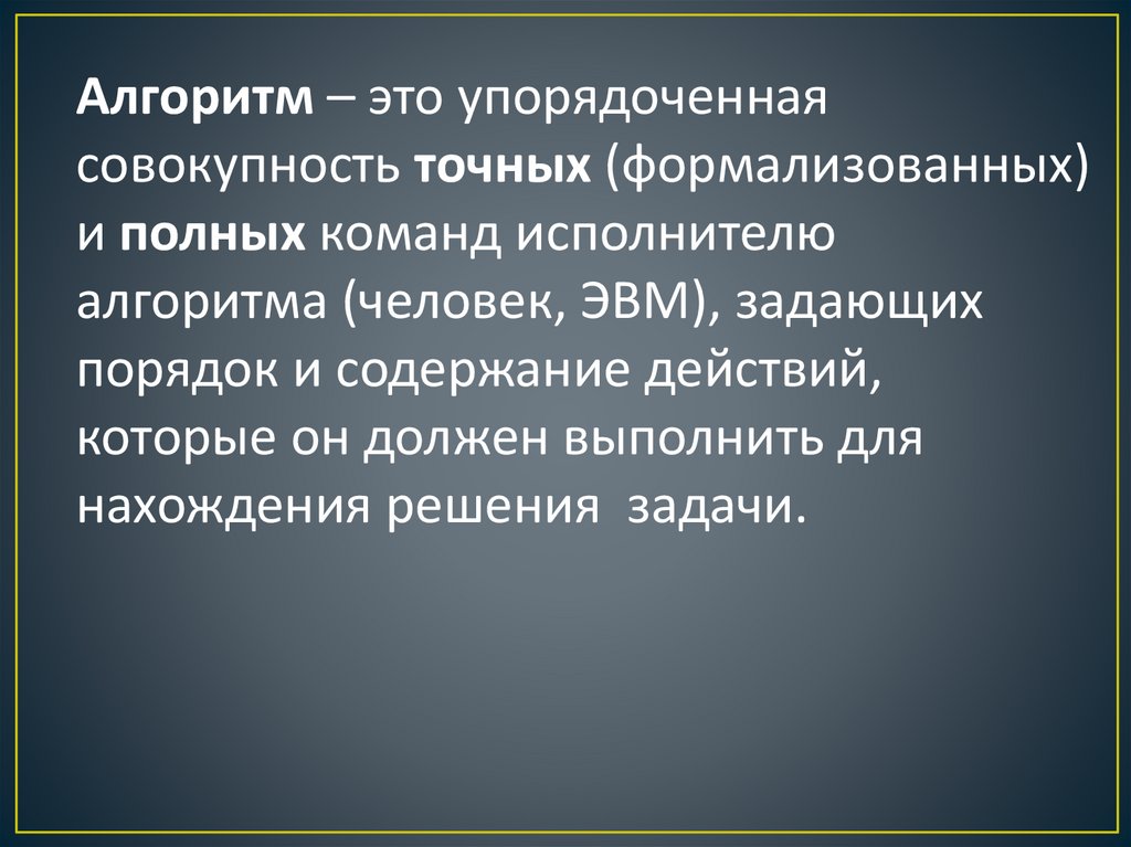 Алгоритм – это упорядоченнаясовокупность точных (формализованных)