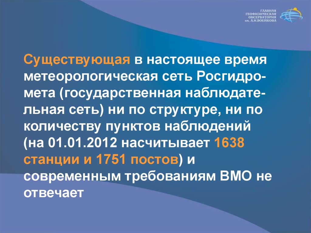Существующая в настоящее времяметеорологическая сеть Росгидромета (государственная наблюдательная сеть) ни по структуре, ни по