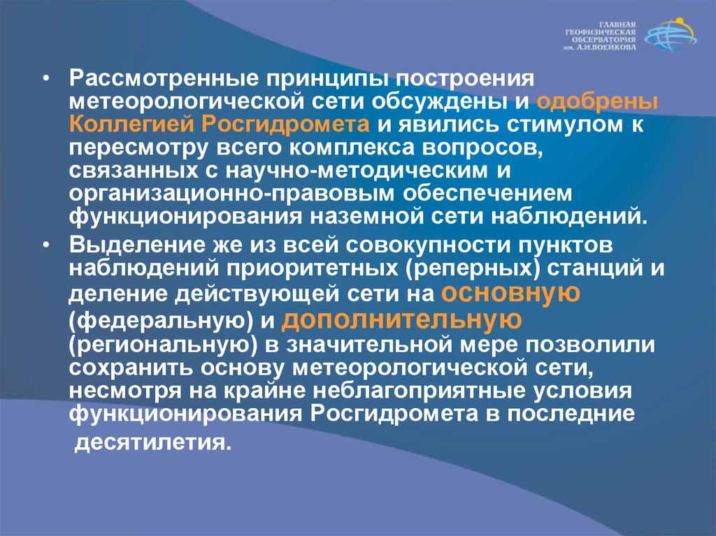 • Рассмотренные принципы построенияметеорологической сети обсуждены и одобрены
