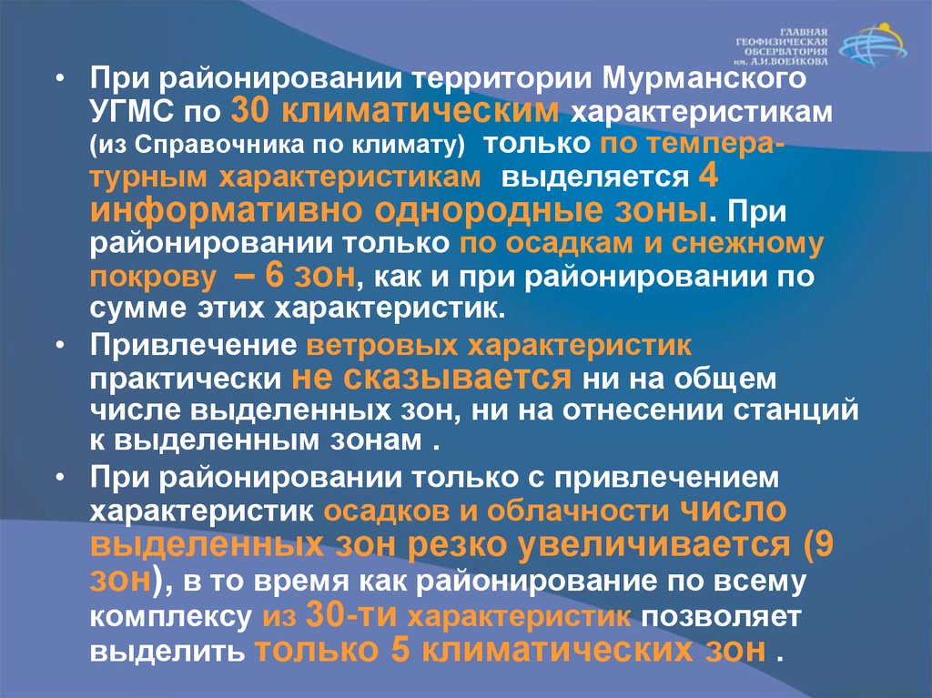 • При районировании территории МурманскогоУГМС по 30 климатическим характеристикам