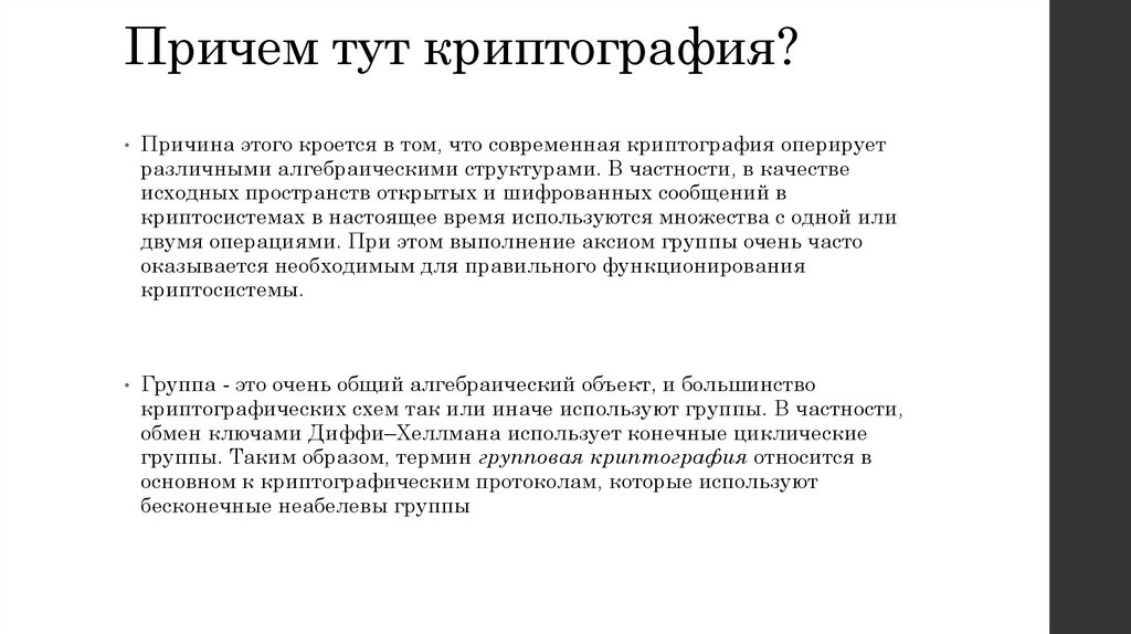 Причем тут криптография?• Причина этого кроется в том, что современная криптография оперирует