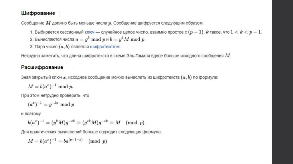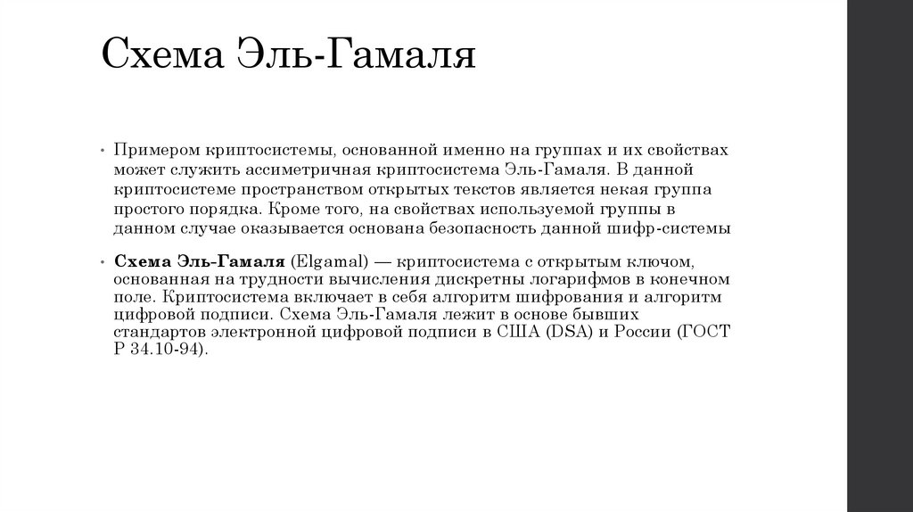• Схема Эль-Гамаля (Elgamal) — криптосистема с открытым ключом,