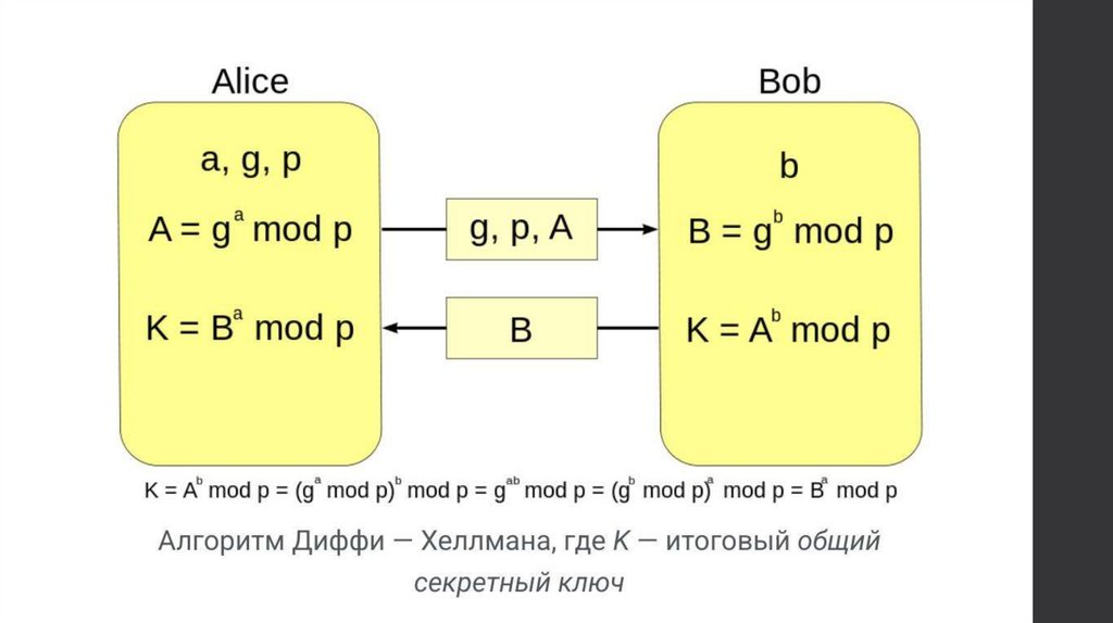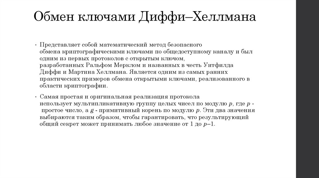 Обмен ключами Диффи–Хеллмана• Представляет собой математический метод безопасного