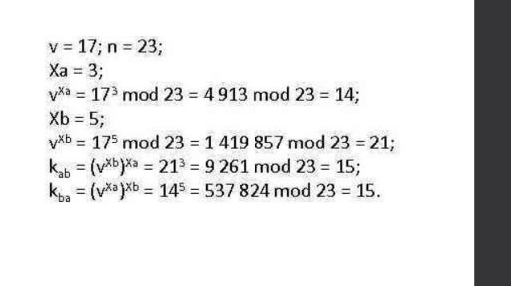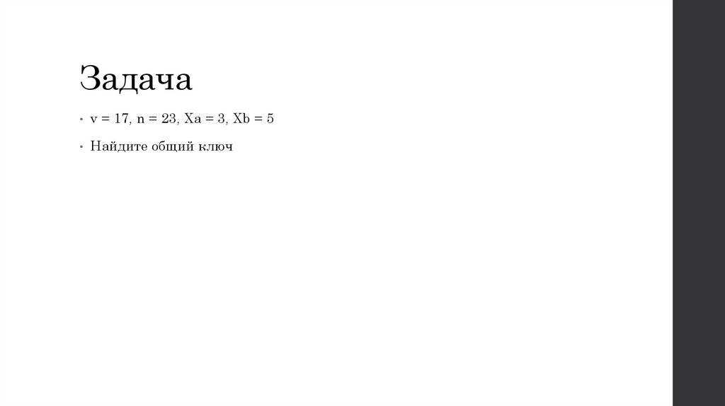 Задача• v = 17, n = 23, Xa = 3, Xb = 5