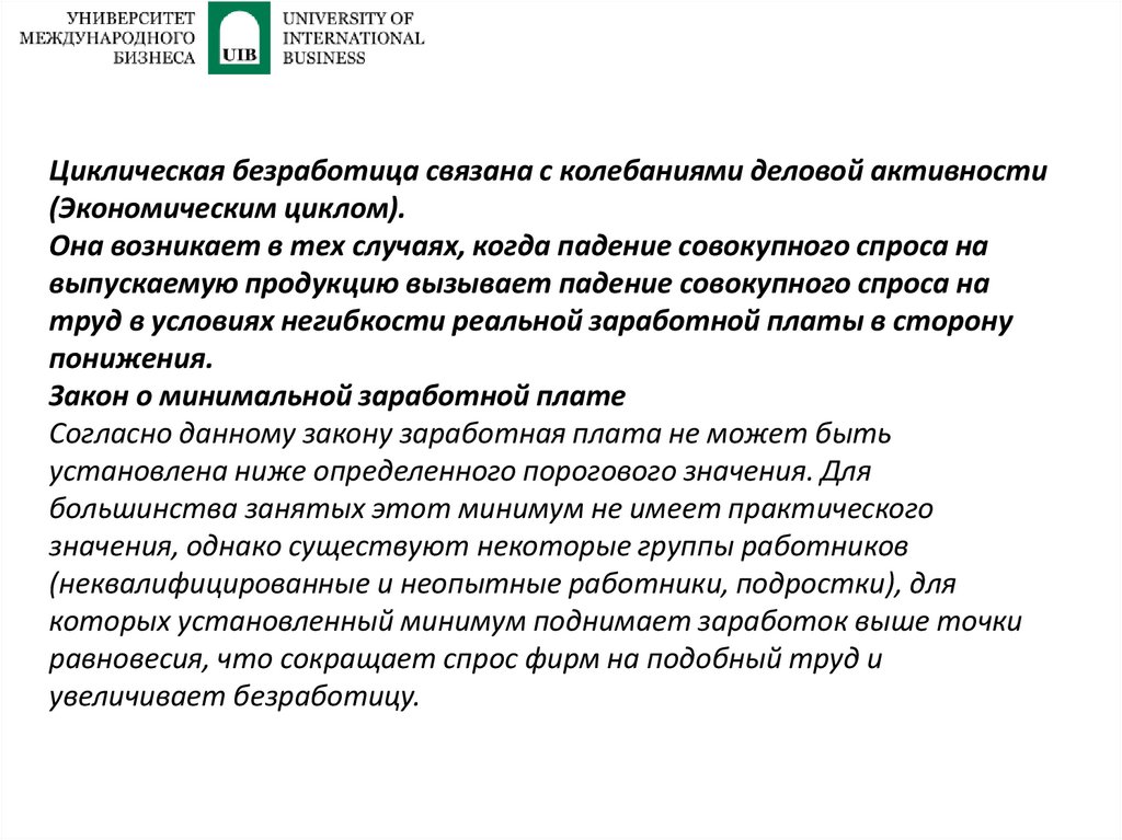 Циклическая безработица — возникает в периодциклического экономического спада и недостатка спроса.