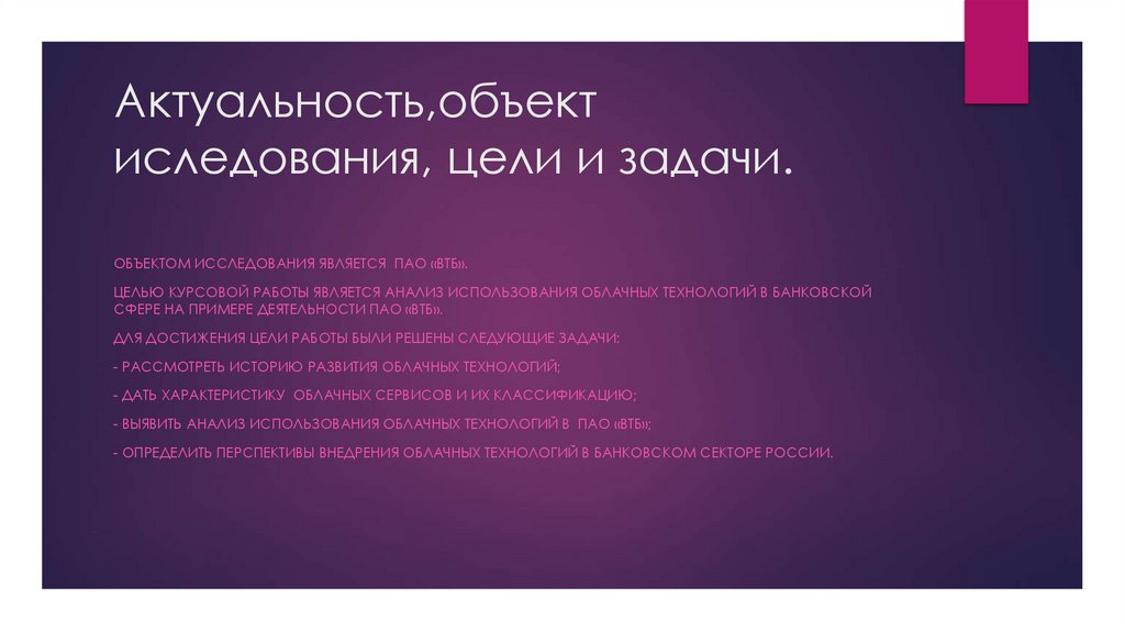 ЦЕЛЬЮ КУРСОВОЙ РАБОТЫ ЯВЛЯЕТСЯ АНАЛИЗ ИСПОЛЬЗОВАНИЯ ОБЛАЧНЫХ ТЕХНОЛОГИЙ В БАНКОВСКОЙ