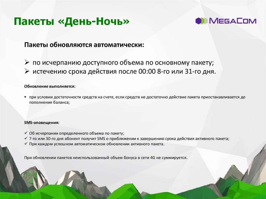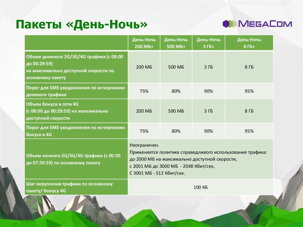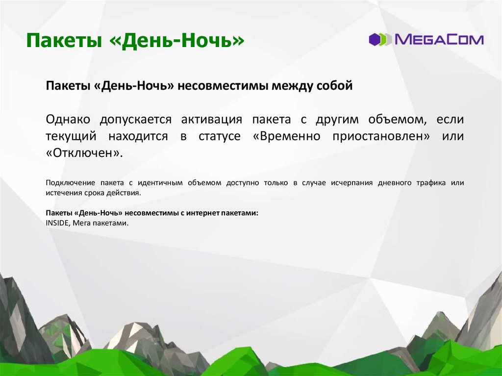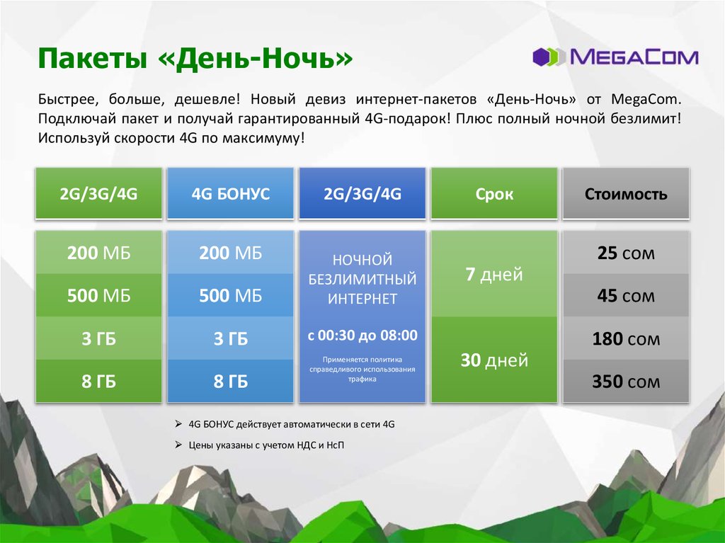 Пакеты «День-Ночь»Быстрее, больше, дешевле! Новый девиз интернет-пакетов «День-Ночь» от MegaCom.